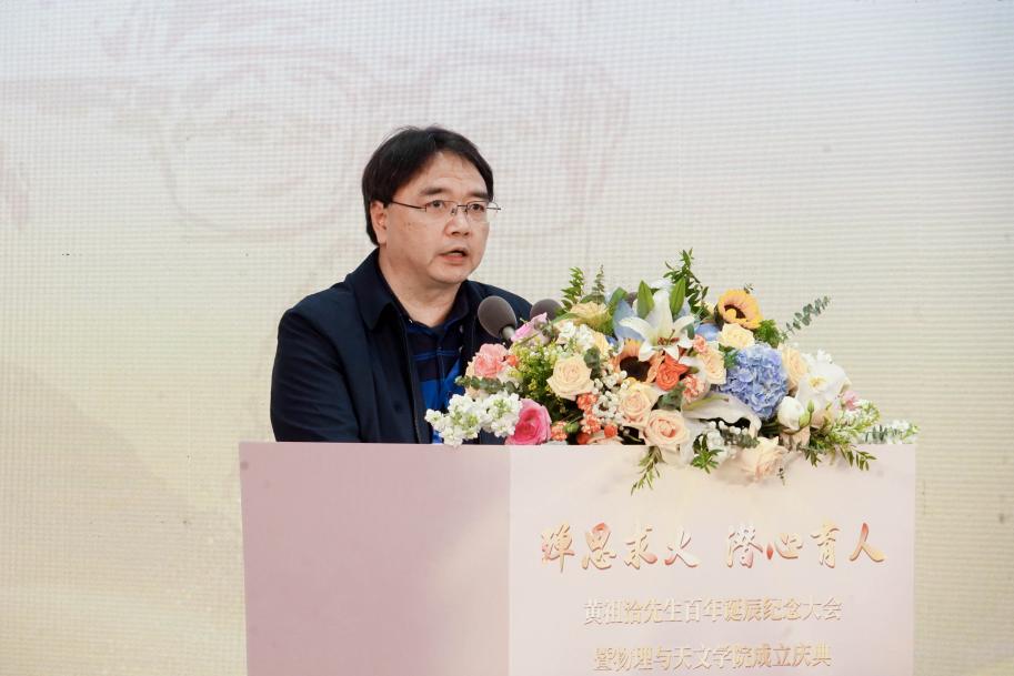 清华大学物理系主任段文晖院士回顾了黄祖洽先生在清华大学的求学生涯,深切缅怀了先生对国家、对科学、对教育的巨大贡献,表达了对先生的崇高敬意。他激励与会专家学者要像先生一样,一方面殚思求火,追求科学真理,另一方面潜心育人,为国家培养更多优秀人才,为建设教育强国尽绵薄之力,不愧新时代的历史使命。