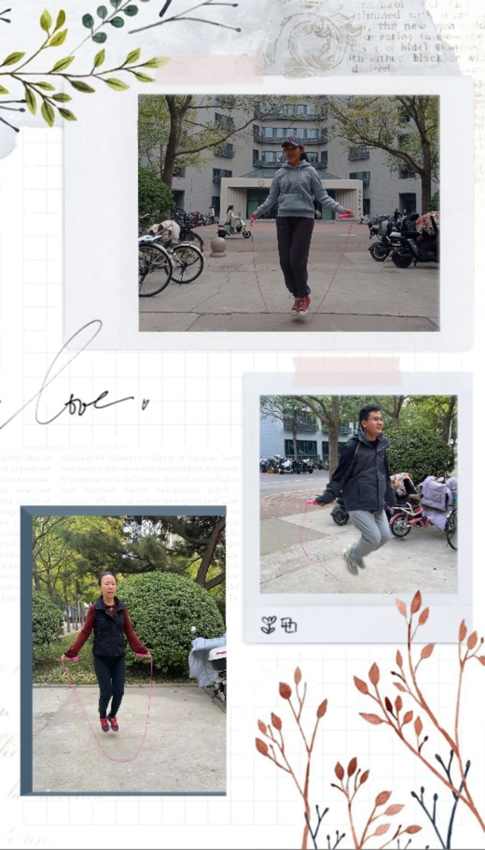 2022年11月2日,迎着秋日的阳光,吹着凉爽的微风,老师们相聚在物理楼外的小广场上。作为一项传统的健身活动,跳绳以其不受空间限制、器材简单而受到大家的喜爱。此次跳绳活动的要求是个人跳绳一分钟,以个数记成绩,最后通过跳绳成绩来确定奖励等级。简易的跳绳健身活动受到了老师们的普遍欢迎,大家放下了工作的压力,尽情享受着运动的乐趣。每一位参赛选手都表现出了不凡的实力,个个生龙活虎,人人争先恐后,舞动绳子的他们就像空中跳跃的精灵。每一位老师在这短短一分钟里都展现出了自己的个性和活力,收获了健康与快乐。老师们自信阳光、明媚灿烂的笑脸,积极向上、努力拼搏的身影,描绘出秋日校园中最为亮丽的一道风景。