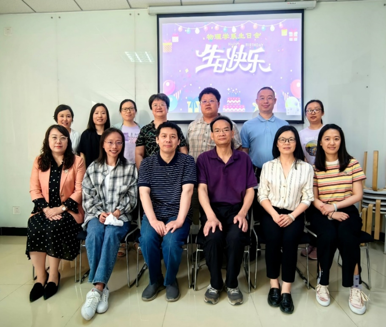 2023年5月26日中午,科技楼C401房间里洋溢着生日的喜庆气氛,参加生日会的老师们开心的在背景墙前合影留念。老师们分享蛋糕,共进午餐,谈论趣事,欢声笑语充满了每个角落。一块块生日蛋糕,代表着一个心愿,一份祝福;孕育着一种希望,一份期盼;包含着一份成长,一份健康。一张张幸福的笑脸,许下这一年最美好的心愿,共同分享着生日的喜悦,感受着物理学系大家庭的温暖。