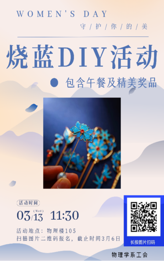 国际劳动妇女节,又称“联合国妇女权益和国际和平日”(U.N. Day for Women's Rights and International Peace),是在每年的3月8日为庆祝妇女在经济、政治和社会等领域作出的重要贡献和取得的巨大成就而设立的节日。为了庆祝2024年国际劳动妇女节,展现物理学系女教师的风采和力量,系工会于3月13日举办了一场以“了不起的她”为主题的手工烧蓝DIY活动。