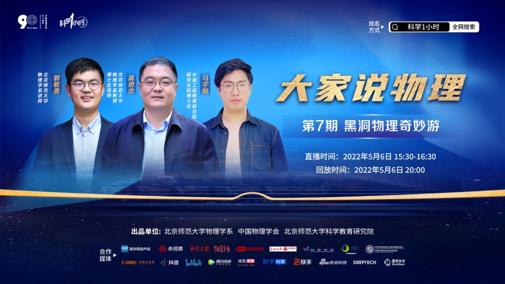 此次直播活动依托中国物理学会《科学一小时》之大家说物理系列科普活动,由物理学系教授高思杰、青年教师郭敏勇及我系优秀毕业生现中国工程物理研究院博士后马宇翰共同展开题为“黑洞物理奇妙游”的科普课程。黑洞物理相关的引力与相对论研究是物理学系优势特色学科方向,具有长期的师资传承和教研积累,包括梁灿彬教授和赵峥教授在内的多位名师也一直从事相关科学前沿的科普工作,在国内外有着重要影响力。“黑洞物理奇妙游”直播课程用通俗易懂的语言、生动有趣的例子和简单易行的类比实验,讲述