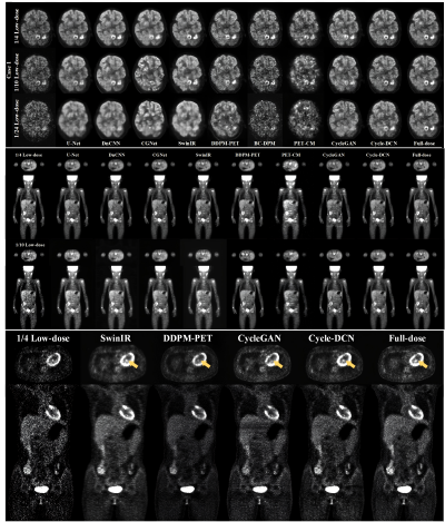 研究基于1224例脑部PET数据、50例全身连续床动扫描数据及245例儿科全身PET数据,开展了跨中心、跨设备、跨人群的系统性训练、测试与外部验证。结果显示,Cycle-DCN在三种低剂量水平下,将平均峰值信噪比(PSNR)、结构相似性指数(SSIM)和归一化均方根误差(NRMSE)分别提升高达56%、35%与71%,在有效抑制噪声的同时,显著保留了脑沟回结构、肿瘤形态与对比度等关键诊断信息。