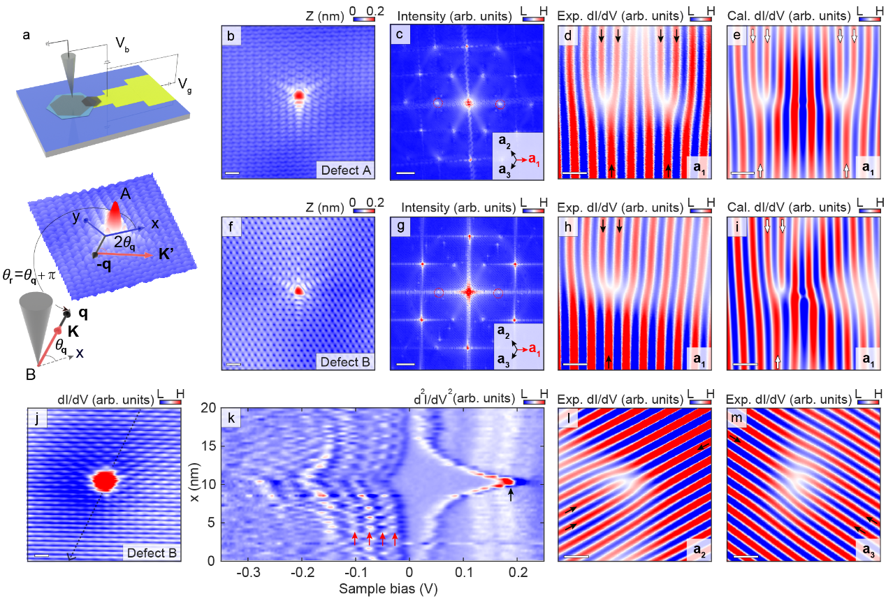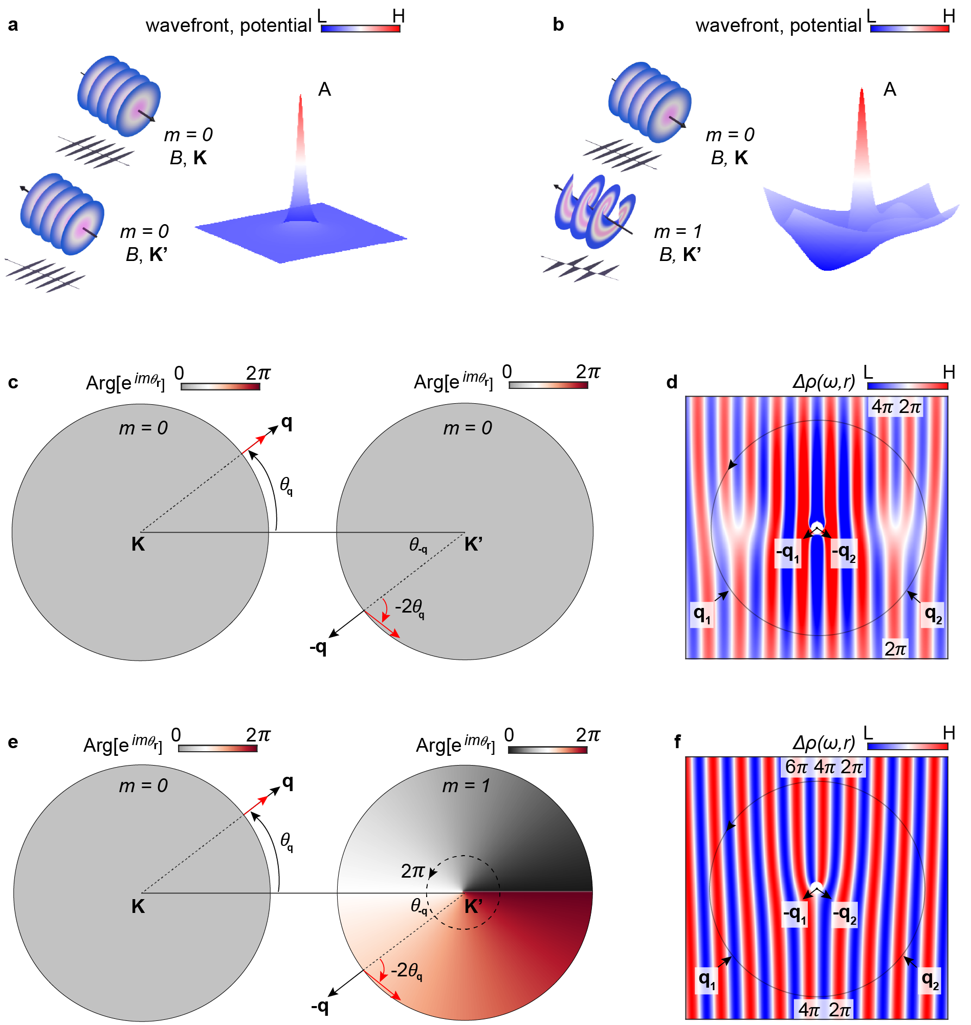 图1 | 谷间散射和波前错位示意图。a,示意图显示了由于缺陷势A,来自位置B、K谷的入射波与反射回位置B的K'谷的波之间的谷间散射。这些波前的轨道角动量m为零。b,由旋转不对称势能引起的波函数谷间散射过程。c,涉及赝自旋旋转的两个谷的谷间散射过程。d,示意图显示了总局部密度态中的波前错位,其中只包含了赝自旋旋转的贡献。e,类似图b中两个谷的谷间散射过程,但同时涉及赝自旋和轨道角动量。轨道角动量对谷的影响表现为相位变化的颜色分布。f,在B子晶格上局部密度态调制,本图包含了赝自旋旋转和轨道角动量耦合的共同贡献。