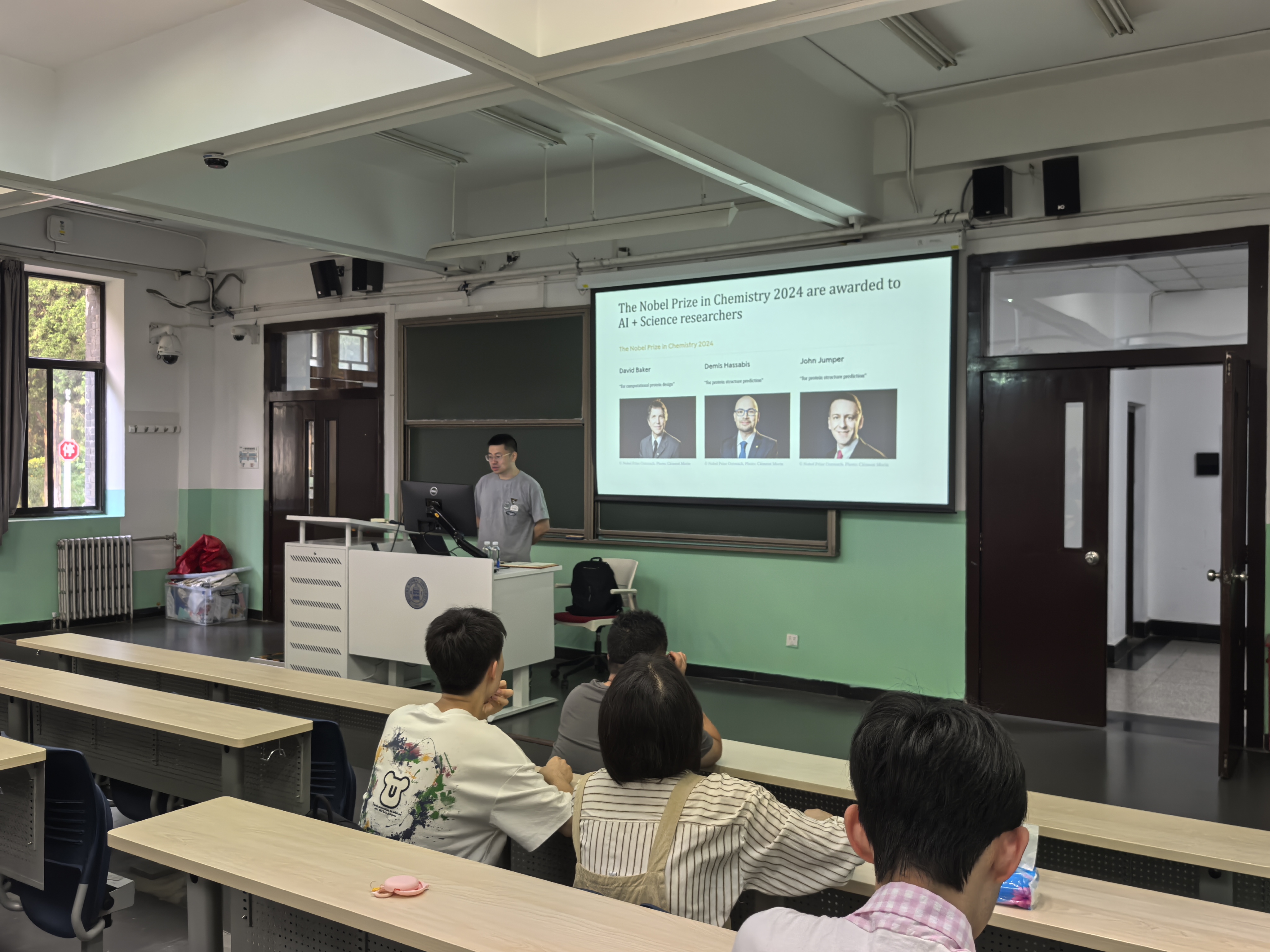 中国科学院理论物理研究所研究员张潘老师为同学们开展了关于人工智能在统计物理中的应用的主题讲座,吸引了许多有志于理论研究的同学的兴趣。来自中关村学院,曾任职于微软研究院的夏应策、金沛然、刘畅三位老师分别开展了人工智能在不同领域的前沿发展与应用的讲座,着重介绍了关于人工智能大语言模型、蛋白质结构预测、小分子设计和蛋白质设计等充满前景的交叉学科应用领域,拓展了同学们的视野。
