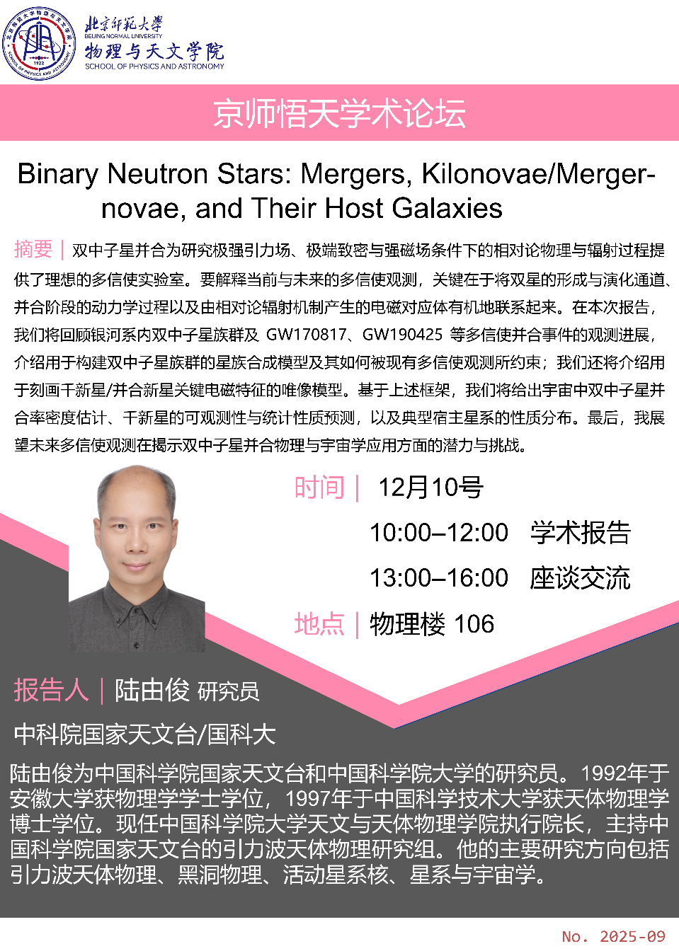 双中子星并合为研究极强引力场、极端致密与强磁场条件下的相对论物理与辐射过程提供了理想的多信使实验室。要解释当前与未来的多信使观测,关键在于将双星的形成与演化通道、并合阶段的动力学过程以及由相对论辐射机制产生的电磁对应体有机地联系起来。在本次报告,我们将回顾银河系内双中子星族群及 GW170817、GW190425 等多信使并合事件的观测进展,介绍用于构建双中子星族群的星族合成模型及其如何被现有多信使观测所约束;我们还将介绍用于刻画千新星/并合新星关键电磁特征的维像模型。基于上述框架,我们将给出宇宙中双中子星并合率密度估计、千新星的可观测性与统计性质预测,以及典型宿主星系的性质分布。最后,我展望未来多信使观测在揭示双中子星并合物理与宇宙学应用方面的潜力与挑战。