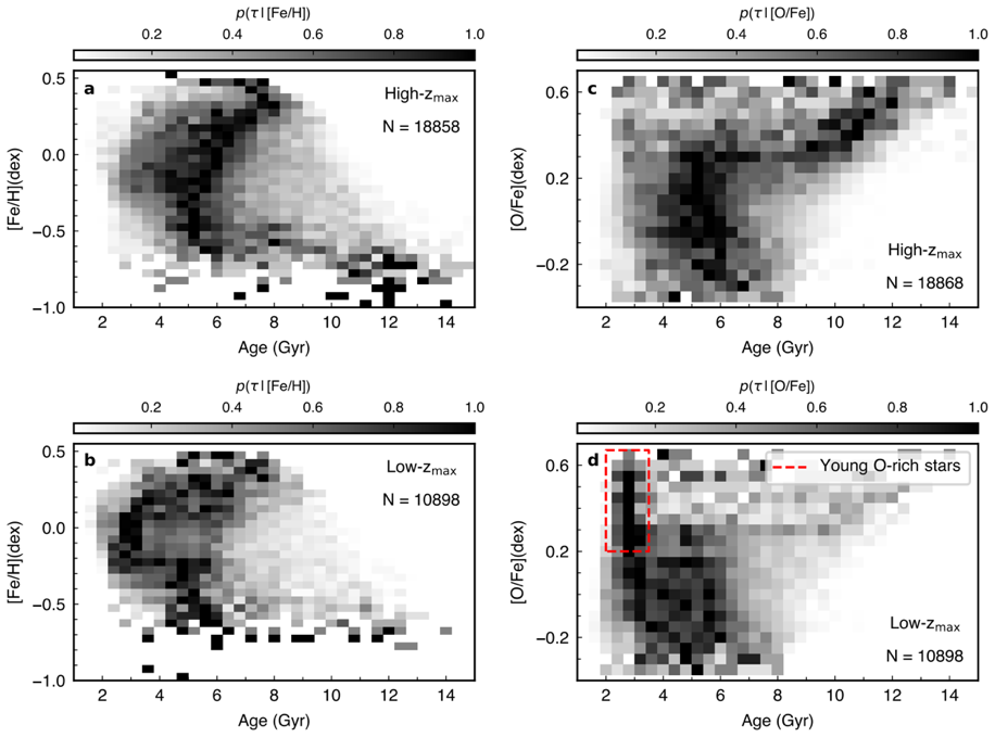 图1. (a-b)本地银盘样本在归一化的年龄-[Fe/H]空间的分布,(a)为垂向距离较大(Zmax > 0.4 kpc)的区域,(b)为垂向距离较小(Zmax < 0.4 kpc)的区域。(c-d)本地银盘样本在归一化的年龄-[O/Fe]空间的分布,(d)中的红色框表示年轻的富氧星。
