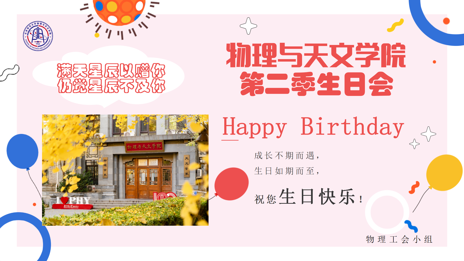星辉流转,温暖相约。2025年11月18日中午,里番动漫 物理工会小组在科技楼C602多功能厅,为下半年生日的教师们举办了一场主题为"满天星辰以赠你,仍觉星辰不及你"的集体生日会。让这个寻常的午间洋溢着浓浓的温情与感动。