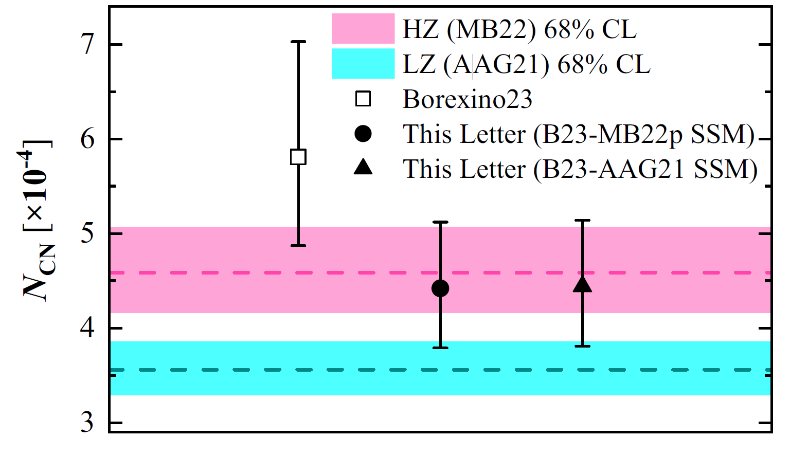 图1:基于本次工作重新评估的太阳光球层 CN 丰度,并与 Borexino 实验结果及高、低金属丰度模型(HZ、LZ)的预测区间进行对比。