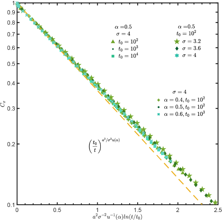 ]),粒子在一维晶格(晶格间距 a=1)中对数老化随机扩散的自相关函数特征。
