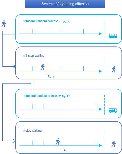 图1 | 我们通过一个乘客等公交的场景来展示对数老化扩散过程。每个公交站的发车间隔时间遵循长尾分布。当乘客到达第