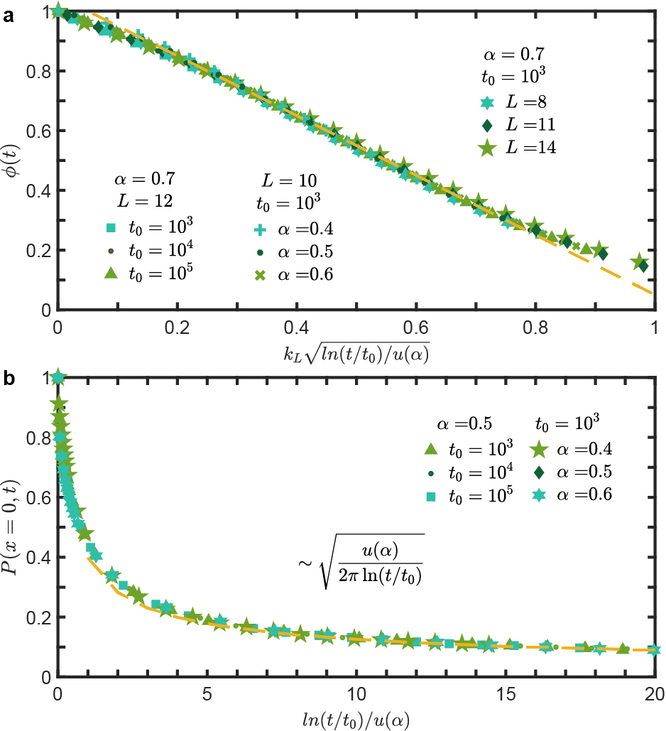 为系统老化时间)。生存概率的这种特征成功解释了在Anderson玻璃态中观测到的电导率的对数老化现象[3]。(2)研究发现,对数老化随机过程的位置自关联函数具有幂律形式