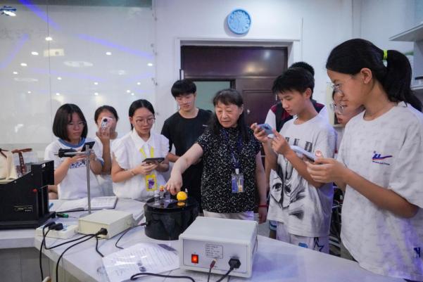 走出前沿阵地,营员们旋即沉醉于物理实验教学的深厚底蕴,在物理实验教学中心,在老师们的引领下,塞曼效应、核磁共振等经典实验重现科学史上的光辉瞬间;X射线衍射解析晶体密码、扫描探针初探纳米世界、磁控溅射见证薄膜生长、高温超导感受零电阻奇迹……低温、真空、激光交织成实验的华章,严谨的探究与创新的火花在此碰撞交融。