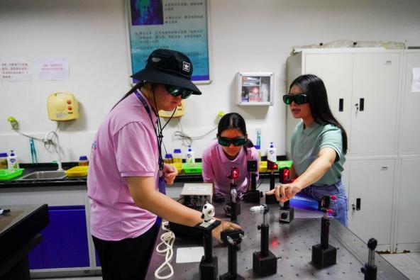 在夏令营创新实践课堂,学子们化身“科学探秘者”,以双手为探针,深度体验声波谐振管、声速测量、光纤光谱仪、偏振光研究、迈克耳孙干涉仪和全息照相六大物理实验,亲手触摸物理世界的脉搏。实验室里,在专业老师们的带领下,同学们通过声波谐振管实验触摸声音的本质,在光纤光谱仪前解码光的密码;借偏振光研究揭示电磁波的振动奥秘,用迈克耳孙干涉仪捕捉纳米级的空间涟漪;更在全息暗室中见证三维虚像的诞生,在声速测量中解析介质弹性的真谛。每一次示波器波纹的跳动、每道光谱峰值的闪耀、每个全息影像的浮现,都将书本上抽象的公式转化为指尖可触的科学现实。学生们专注记录实验数据,热烈讨论异常现象,在协作中锤炼操作精度,每一次沉浸式体验,孩子们眼中迸发的不仅是成功的喜悦,更是对物理规律深邃之美的震撼。