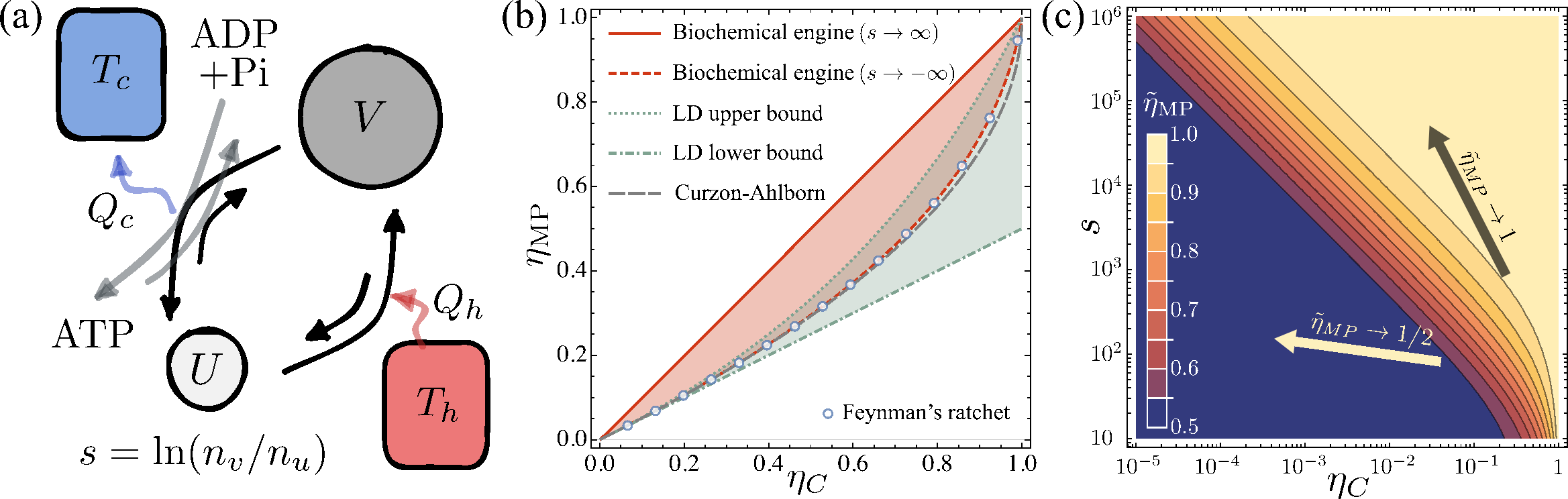 图 1(a) 生化热机最小模型,包含两个能级U和V,分别与冷热两个温度为Tc和Th的热库耦合。系统可以通过ATP合成和自发跃迁两种方式在能级间转换,两个能级的简并度之比由s = ln(nv/nu)表示。(b) 热机的最大功率效率(