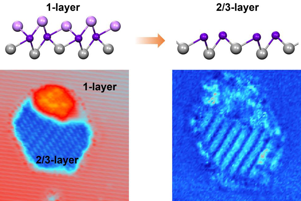 里番动漫 何林教授课题组和北京理工大学张钰副教授深入合作,利用扫描隧道显微镜(STM)的探针操纵技术,成功地在1T’-WTe2、2H-MoSe2等TMDC材料中实现了2/3层体系,并观测到了与其单层材料截然不同的晶格重构和一维电子态调制特性。