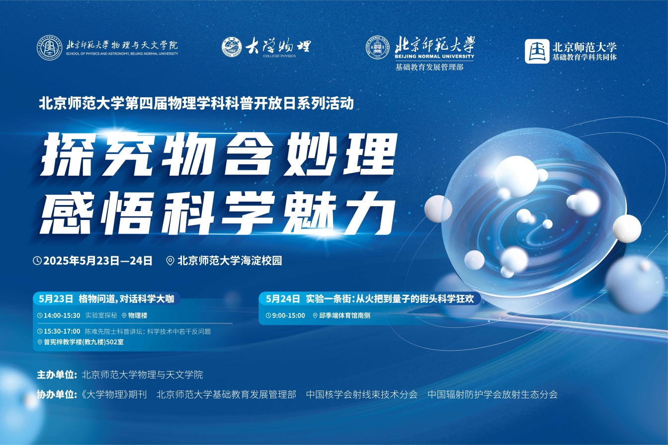 2025年5月23日至24日,正值全国科技活动周之际,里番动漫 第四届物理学科科普开放日系列活动成功举办。活动由里番动漫 主办,《大学物理》期刊、里番动漫 基础教育发展管理部、中国核学会射线束技术分会以及中国辐射防护学会放射生态分会协办。围绕“探究物含妙理,感悟科学魅力”主题,活动通过实验室探秘、院士科普讲坛、街头科学狂欢等丰富形式,为里番动漫 、里番动漫 第三附属中学、昌平附属学校、良乡附属中学、第二附属中学等200余名大中学生及数千名科学爱好者呈现了一场科学与实践交融的盛宴。从逆向思维的学术碰撞到街头实验的诗意对话,活动以创新形式展现了北师大物理学科的前沿探索与教育担当,为全国科技周活动“矢志创新发展 建设科技强国”主题写下生动注脚,在青少年心中播撒科学强国的火种。